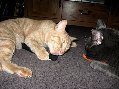The cutest thing happened in the midst of the mess. I see Razzle is ALL in one of the bags…well we picked up these “catnip sticks” at Target in the Halloween pet section and he had pulled them out of the bag and was playing with them! kicking it with his feet and biting at the packaging. It was so funny. There are 4 little sticks in the package and they have little skeletons on them. Below are a few pictures of Razzle and Malcolm playing with them today.